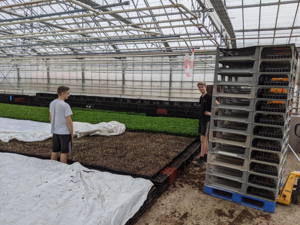 - zaaiplaten uit de kiemcel in de kas neerzetten